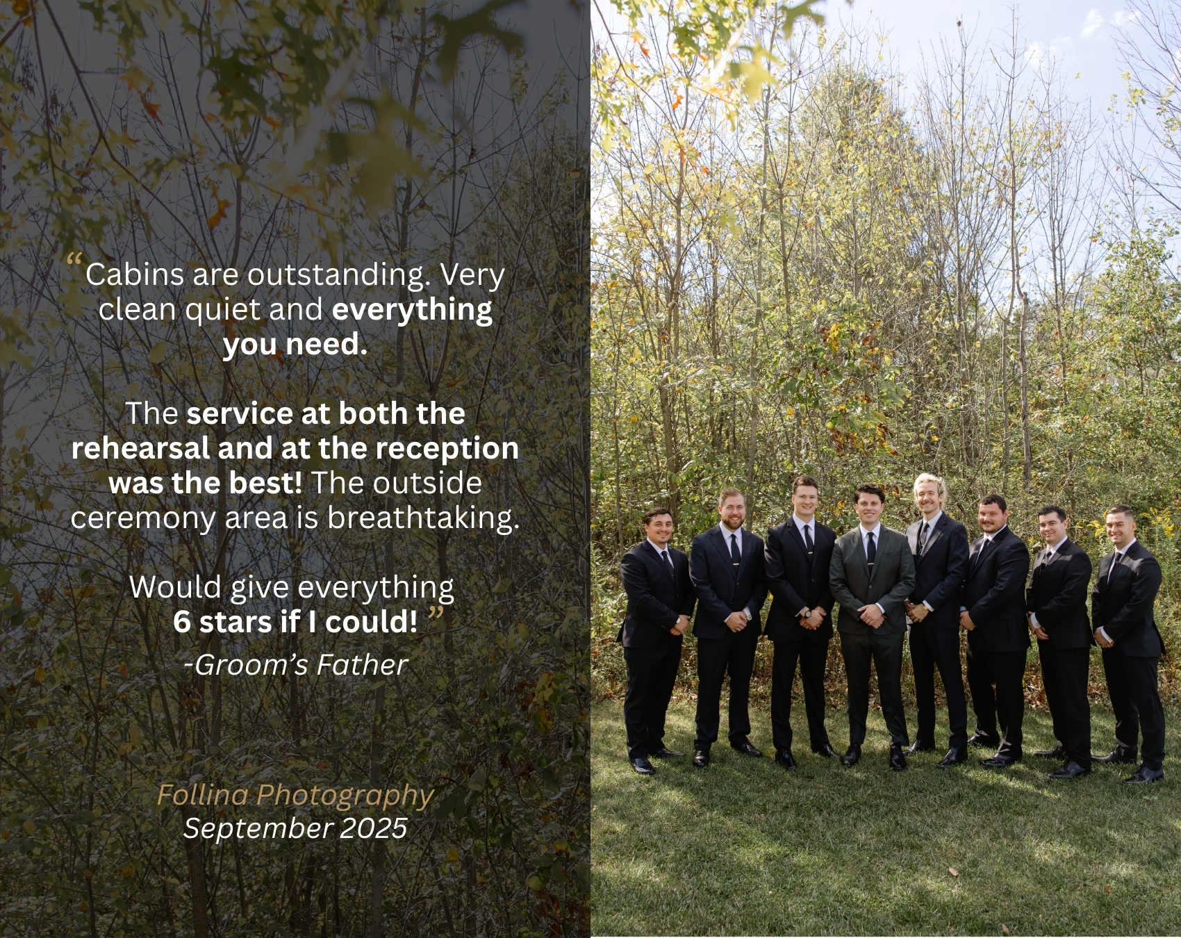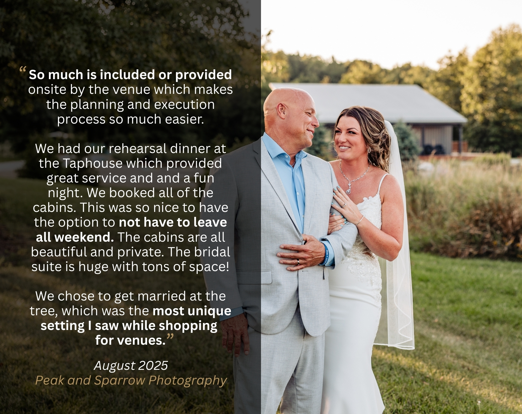 Nestled on 64 acres of lush trees and rolling meadows just outside Columbus, Retreat 21 is an all-inclusive wedding venue that blends natural beauty with modern luxury. With onsite cabins, a scenic vineyard and winery, panoramic views, and stunning indoor and outdoor spaces, we offer the perfect backdrop for the experiential wedding weekend you’ve been dreaming of.